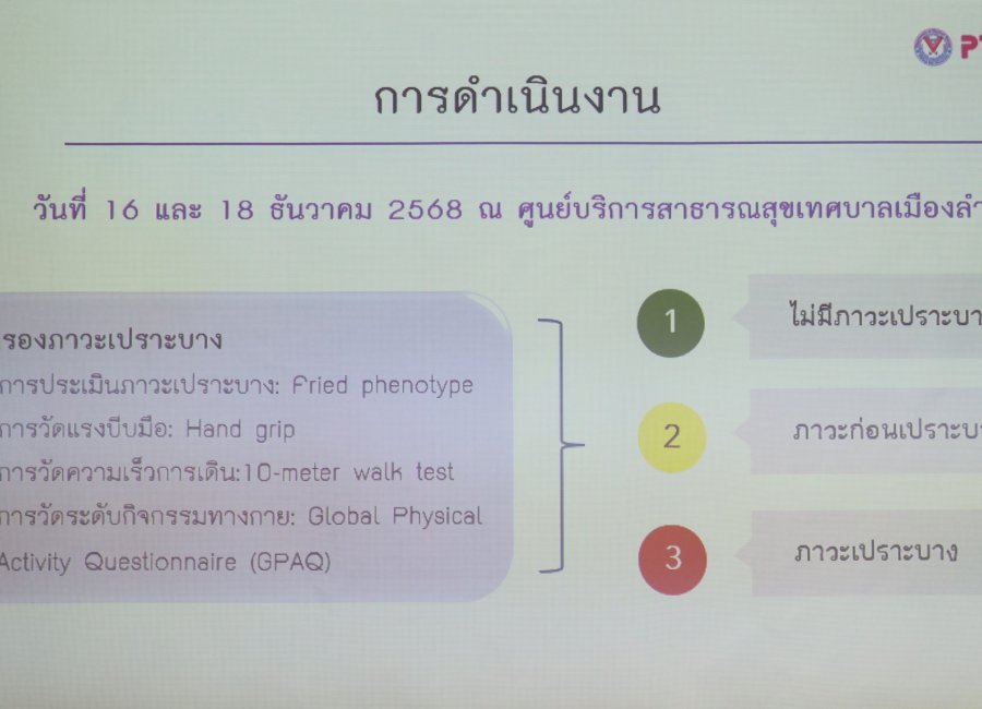 เพื่อชี้แจงผลการคัดกรองภาวะก่อนเปราะบางและภาวะมวลกล้ามเนื้อน้อยในผู้สูงอายุในเขตเทศบาลเมืองลำพูน ที่ได้คัดกรองในวันที่ 16 และ 18 ธันวาคม 2568 ที่ผ่านมาและได้ประชุมร่วมกันเพื่อวางแผนการทำกิจกรรมที่ต่อยอดจากการคัดกรองภาวะก่อนเปราะบางและภาวะมวลกล้ามเนื้อน้อย เพื่อให้ผู้สูงอายุในเขตเทศบาลเมืองลำพูนได้รับการดูแลด้านสุขภาพได้อย่างต่อเนื่องและครอบคลุม